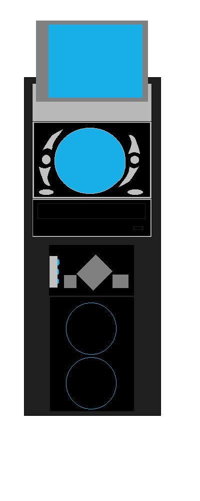 Then right under that will be the DVD drive. In both of the 3.5 bays I will cover it with modder's mesh and take out the bay cover of course, then behind the modder's mesh will be and Intel Pentium I cpu tilted (gray square in the middle) then right by along the sides will be a suSE Linux case badge and a Nvidia case badge, then lit up by three leds on the left side (Its three bright leds in a little plastic case). This is my plan on what it will look like, I have the lcd panel already now I just need to get it working (has a burnt out transistor on the controller board) and I'm going to make the cdrom tray all flat on the top then paint it black and attach some small spring loaded hinges so that the lcd panel will pop up. Not exactly sure what it will be used for, most likley Kazza or Winamp, or hey even winbolo! :p Or just use it to show graphics that bounce to the music. So what do you think? Any suggestions?